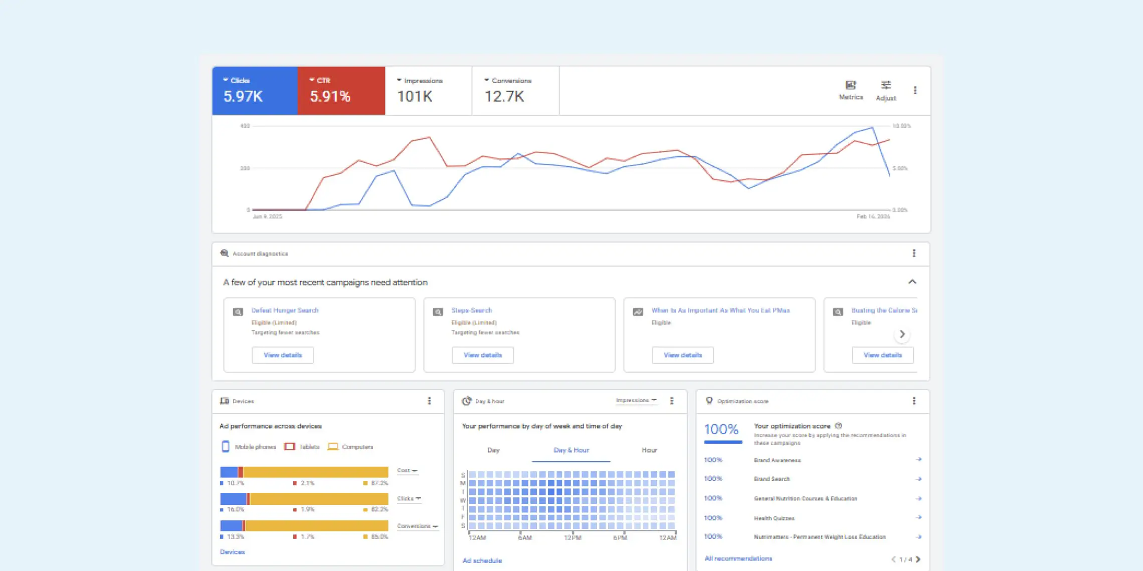 Before working with Tizbi, the Nutrimatters account was treating the Ad Grant like traditional performance marketing. However, Google Grants require a fundamentally different approach: maximizing quality and relevance first, which naturally improves CTR and maintains compliance.